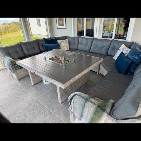 Utemøbelsett i rotting bestående av modulsofa med lyse puter og et bord. Settet er designet for utendørs bruk og er pent brukt og fremstår i god stand. Putene følger med. De har vært oppbevart inne når de ikke har vært i bruk. Bordet har hel glassplate som kan tas av.