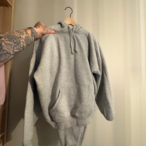 Et sett med hoodie og bukser, fargen på malingen på linningen har falmet og snørene er slitt.