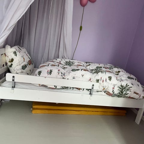 IKEA juniorseng i metall i rosa. Sengen har en sengebunn med treribber og en metallramme med stenger og sidekanter. Passer for barn som har vokst ut av sprinkelsengen sin og flyttet til en større seng. Passer som overgangsseng på barnerom. Mål følger standard juniorsengmål fra IKEA (se målskisse på bildet). Madrass er ikke inkludert. Må hentes i Ås.