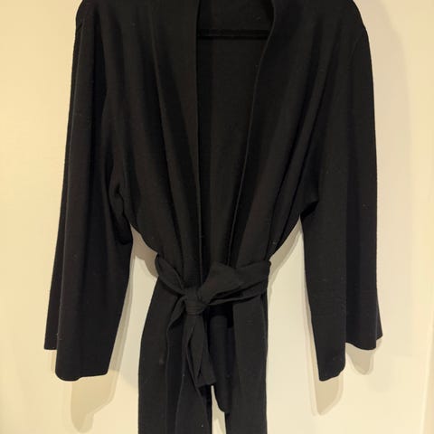 Lindex kimono jakke for dame i størrelse XL. Jakken er svart og laget av 100 % viskose. Modellen har lange ermer og åpen front uten lukking. Stoffet er lett og faller mykt, med lommer foran. Passer som et lett lag over topp eller kjole.