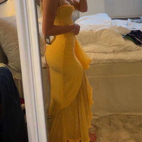 House of CB festkjole i rød tyll i størrelse XL for dame. Kjolen har tettsittende overdel med dyp utringning og smale stropper, samt markert midje. Skjørtet er midi-langt med flere lag tyll som gir volum. Glidelås i ryggen. Egnet som penkjole til formelle anledninger som fest og selskap.