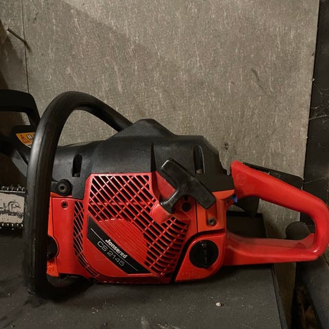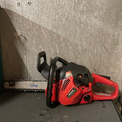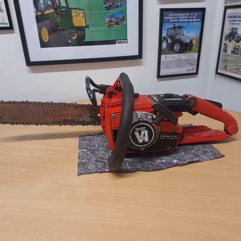 Homelite super 2 motorsag selges. Motor går rundt og starter på startgas men stopper etter den forbrenner den, trolig et problem med bensintilførselen.