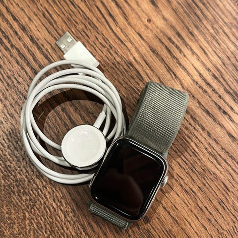 Apple Watch SE. Klokken leveres med mørk lilla sportreim i silikon og magnetisk ladekabel med USB‑C‑tilkobling. Passer til daglig bruk, trening og varslinger fra tilkoblet iPhone. Reimen har flere justeringshull for tilpasning til håndleddet.