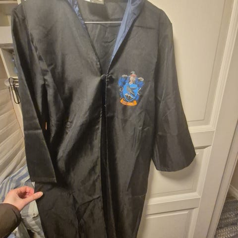 Harry Potter Galtvort kappe med tilhørende slips og skjerf for unisex. Kappen er svart på utsiden med rød innside. Skjerfet er stripet i rødt og gult med våpenskjoldmotiv. Slipset er rødt med gule striper. Settet passer til utkledning, temafester eller karneval inspirert av Harry Potter-universet. Mål på lengde og ermer fremgår av bildene med målebånd.