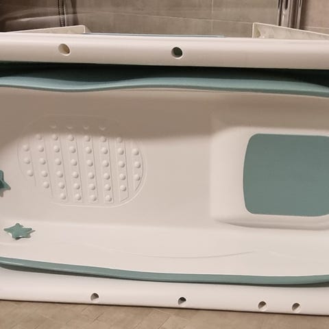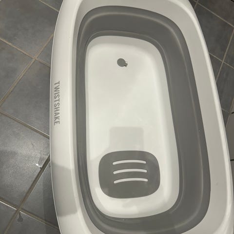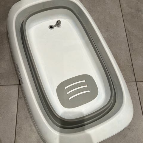 Sammenleggbart babybadekar i hvit og grå plast. Badekaret har rektangulær form med integrert sklisikkert felt i bunnen for bedre stabilitet. Det kan klappes sammen for enklere oppbevaring og tar mindre plass når det ikke er i bruk. Egnet til bading av spedbarn og små barn i hjemmet eller på reise.