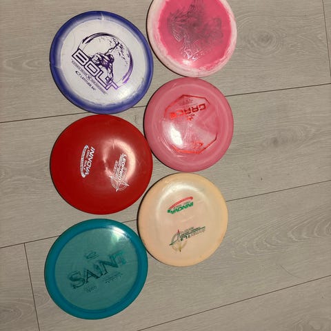 Selger en pakke med discer i variert tilstand. Alt mellom godt brukt til lite brukt.
