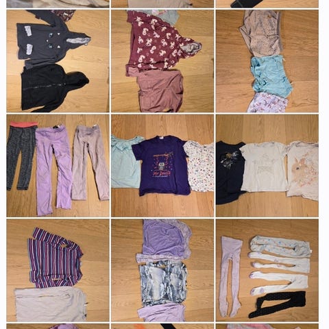 Nydelig klespakke jente str 122-128,Pakken inneholder ulike typer klær som gensere, overdeler, bukser og ytterjakker. Klærne er egnet for jente og passer til hverdagsbruk og fritidsbruk. Materiale kan variere mellom plaggene, men består typisk av myke og behagelige tekstiler til barneklær. Fargene er varierte med blant annet rosa, røde, blå og nøytrale toner, som gir flere kombinasjonsmuligheter i garderoben
