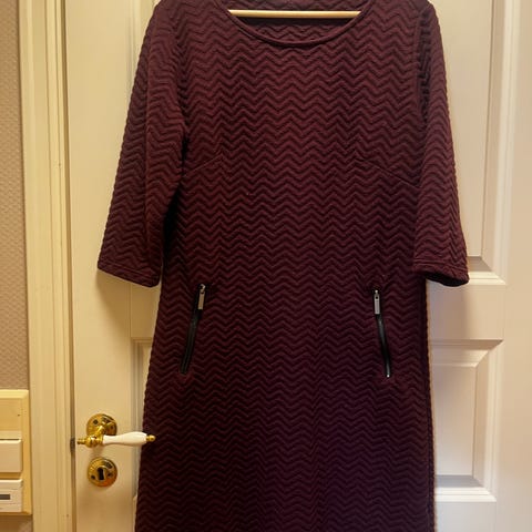 Fransa kjole i størrelse M. Kjolen er blå med mønster og har et rett, enkelt snitt. Den har ermer som rekker omtrent til albuen og rund hals. Materialet er bomull, som gir et mykt og behagelig plagg egnet til hverdagsbruk. Passer til bruk alene eller sammen med strømpebukse eller leggings.