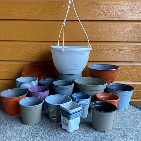 Her er det en del innerpotter til planter,vanningsbrett 15små og 3 store. Flaske med frukträdseffekt som er ca halv. 2 beholdere for stiklinger.