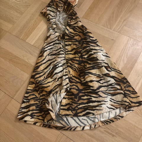 Ukjent merke tigerkostyme. Kostymet består av en heldress med borrelås. Det følger med en matchende litt artig hette :)