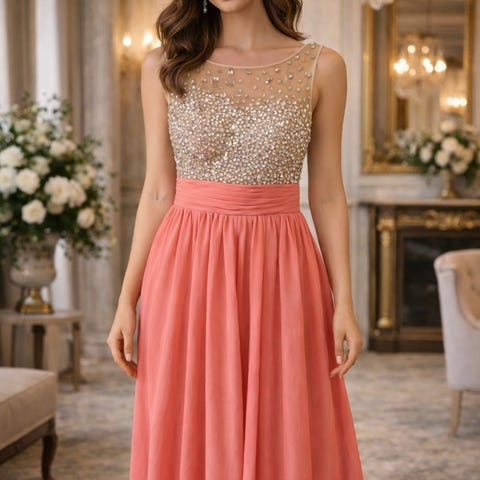 Floyd ballkjole størrelse 8. Lang kjole i rosa chiffon med ermeløst snitt. Overdelen har dekorative blonde- og broderidetaljer, mens skjørtet faller lett og ledig. Passer som penkjole til konfirmasjon, bryllup, ball eller andre formelle anledninger. Kjolen har vaffelsteking bak, så den sitter perfekt rundt livet og brystet! Former seg til deg