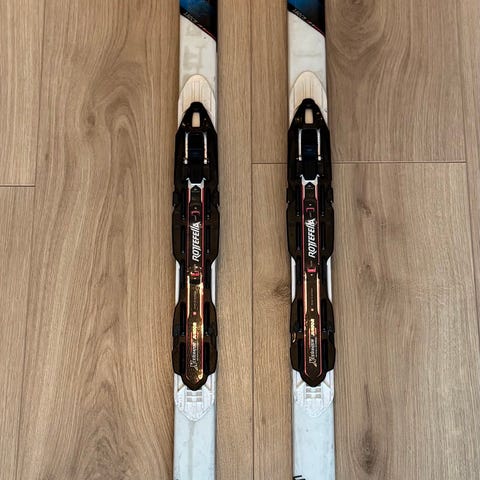 Gode barneski med rottefella bindinger. Skien er smørefri Madshus Race Light 120 cm MG. Kan sendes eller hentes.