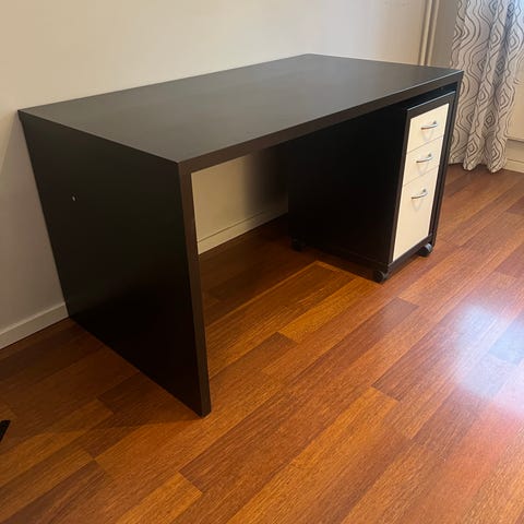 Skrivebord selges. Det er lite og pent brukt. Må hentes på Ullern i Oslo. Skuffer og hyller i god stand. Har en liten sprekk på den ene siden, se eget bilde. Høyde: 73 cm, dybde: 65cm, lengde: 140cm. Kom gjerne med bud