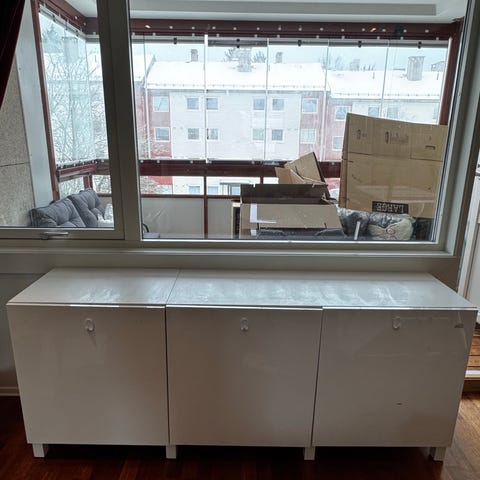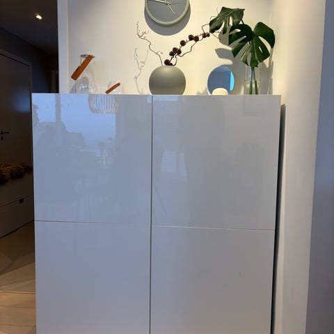 Bestå skjenk fra IKEA. Frosta glass på topp og dører. Glasshyller inni. Mangler bein. Kan kjøpes på IKEA