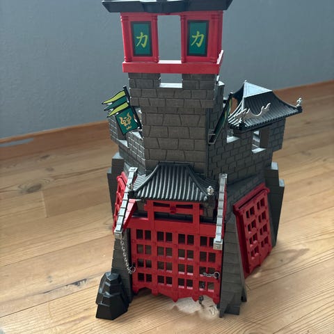 Playmobil borg lekesett med vulkantema. Settet består av en stor borg med tårn, murer og port, utformet i mørke farger med flamme- og lavaelementer. Det følger med flere figurer, hest, våpen og tilbehør som kan brukes til fantasifull lek i ridder- og fantasyunivers. Egnet som byggesett og rollelek for barn som liker borg- og eventyrtemaer. Mangler enkelte smådeler. Ny pris 3500