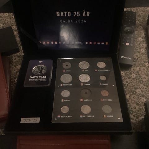 NATO 75 år myntsett samlerboks med minnemedalje og mynter fra ulike medlemsland. Settet er presentert i en egen eske med innfelt plate der myntene er plassert og merket med landenes flagg og navn. Esken inneholder også en separat innkapslet NATO 75 år-minnemedalje datert 04.04.2024. Egnet som samlerobjekt for mynter og minnemedaljer knyttet til NATO-jubileet.