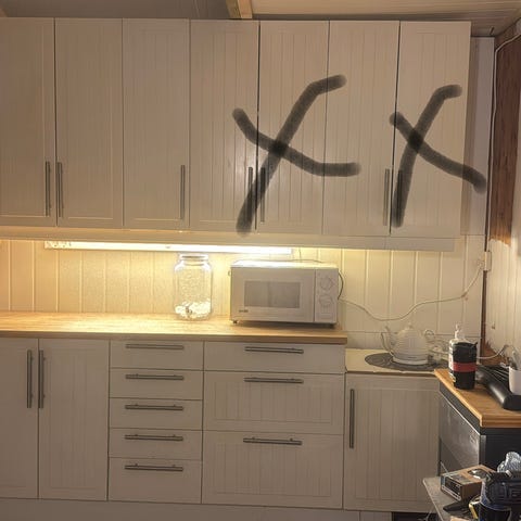 Kjøkkeninnredning i hjørneløsning med grå fronter og laminatbenkeplate. Innredningen består av overskap og underskap med skuffer og skapdører. Det er inkludert vask, blandebatteri, ventilator, komfyr med induksjonstopp og oppvaskmaskin. Alt virker. Mikro og kjøleskap er ikke inkl