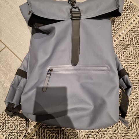 Rains ryggsekk i kunstlær for unisex. Sekken har klaff med to spenner og metallringer i front. Innvendig er det flere rom og lommer for organisering av innhold. Justerbare skulderstropper gjør at sekken kan tilpasses brukeren. Yttermaterialet i kunstlær gir en glatt og vannavvisende overflate. Fargen er blå.