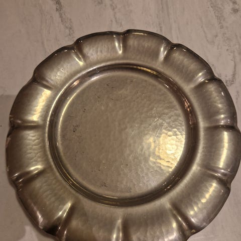 (selges helst samlet) messingtallerker med enkel, hamret dekor langs innerkanten.