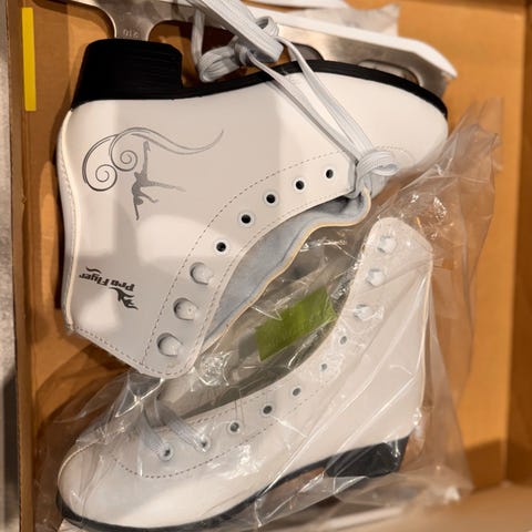 1 par ProFlyer Kunstløpsskøyter str37 selges da de er blitt for små til jenten her i huset nå, knapt brukt. De er slipt og klar til bruk. Pene skøyter og litt stive i sidene rundt anklene som er bra for kunstløpsskøyter. Ingen rust på skøytejernene.
