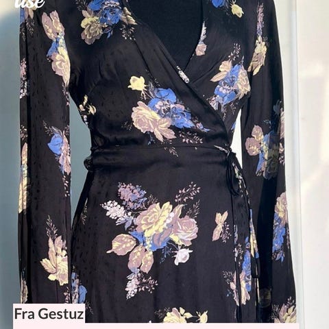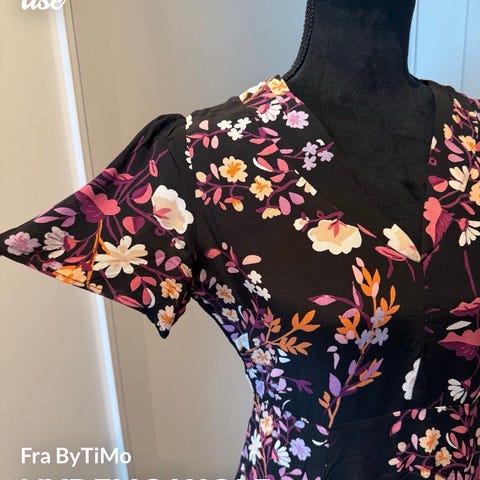 Nydelig kjole fra byTiMo i størrelse S. Kjolen er flerfarget med nydelig blomsterprint på mørk bunn. Den er laget i viskose og har lange ermer. Livpartiet har strikkdetaljer som gir en innsvinget nydelig fasong. Passer som hverdags- eller penkjole avhengig av styling.