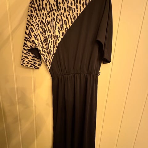 New Look hverdagskjole for dame i størrelse M. Kjolen er grå med et diskret mønster og har en markert, mørk kontrastkant i midjen. Den er laget i polyester og har korte ermer og figurnær passform. Glidelås i ryggen for enkel av- og påkledning. Egner seg som hverdagskjole eller til enkle, pene anledninger.