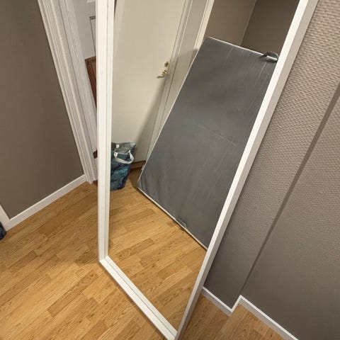 IKEA Nissedal speil i hvit utførelse. Rektangulært veggspeil med smal, hvitmalt ramme. Speilet kan brukes i entré, stue eller soverom, og gir et helfigurspeil når det monteres i passende høyde på vegg. Passer til moderne og enkle interiører. Utmerket stand uten skader på speil eller ramme