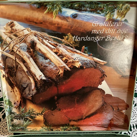 Serviset består av 6 kopp med skål og tallerkener i hvit farge med dekor av dansende par og bårddekor langs kanten. Design som figgjos bunad Hardanger men er stemplet med Erling Kagge as Bergen