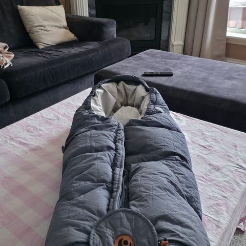 Bugaboo vognpose i grå farge. Vognposen er polstret og har avtakbar frontdel med glidelås. Den er formet for å passe i barnevogn og har åpninger til seler. Egnet til bruk i barnevogn for å holde barnet varmt og skjermet mot vær og vind.
