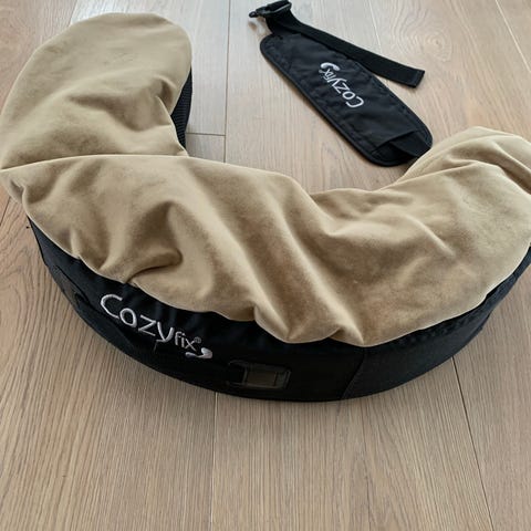 Cozyfix ammepute i beige med svart base. Puten har buet fasong og er utformet for å gi støtte ved amming. Justerbar stropp med spenne gjør at puten kan festes rundt kroppen for mer stabilitet. Trekket ser ut til å være i et mykt stoffmateriale. Egnet til bruk ved amming av spedbarn for å avlaste armer, skuldre og rygg.