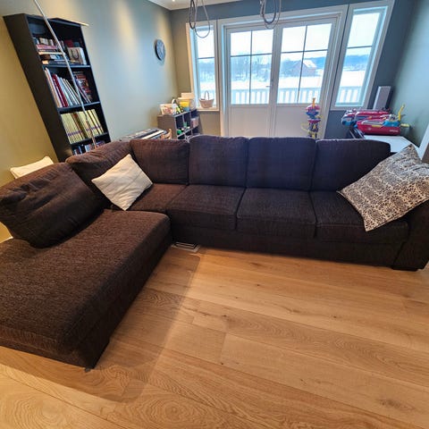 Liten sofa med sjeselong, stått på ungdomsrom. Gis bort pga flytting