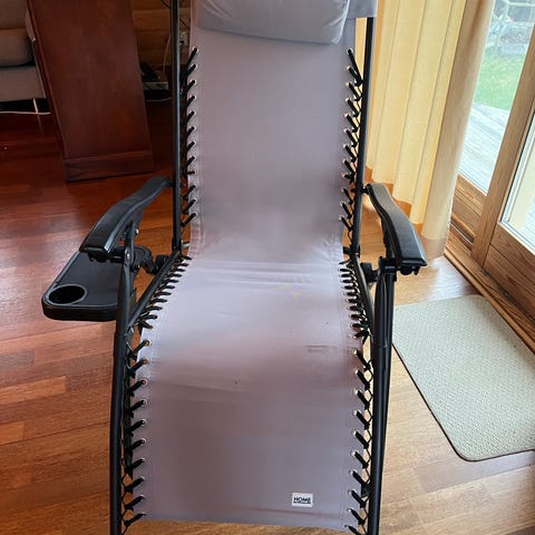 2 sammenleggbare baden baden stoler fra Europris. Grått stoff med svart metallramme. Leveres med avtakbar hodestøttepute. Egnet til bruk på terrasse, balkong eller hage. Stoffet er spent opp med elastiske snorer langs sidene for jevn vektfordeling og støtte.