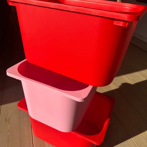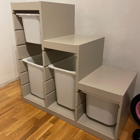 IKEA Trofast oppbevaringsmøbel med plastkasser. Møbelet består av hvite trerammer i trappetrinnsløsning med flere uttrekkbare plastkasser i hovedsakelig grønn farge, samt enkelte kasser i hvit og oransje. Egnet som oppbevaring av leker, hobbyutstyr eller annet barneromsutstyr. Kasser kan tas helt ut og settes tilbake i skinnene. Passer mot vegg på barnerom, lekerom eller gang der det er behov for oversiktlig oppbevaring.