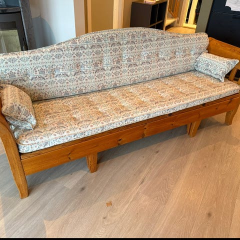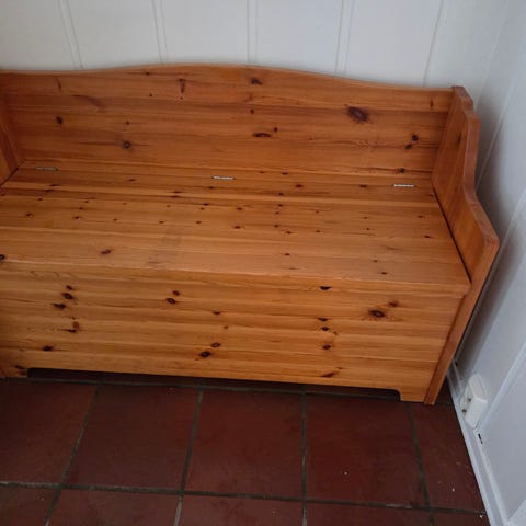 Slagbenk eller spisesofa. Hjemmesnekret. Helt genial da du får plass til mange på denne. For oss har den vært fin til å kunne få mange barn rundt bordet🥰 veldig praktisk med et stort og et mindre oppbevaringsrom. Denne har også en stikkontakt i hver ende som er festet til skjøteledning bak. Vi har litt sorg for at den nå må ut grunnet ombygging. Håper den kan få et nytt hjem hvor noen vil sette pris på denne.