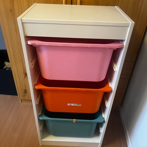 Oppbevaring med plastbokser i farger.