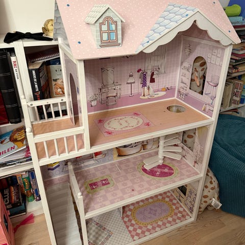 Sara selger sin Dukkehus ca 110 cm høyt med tre interiør.