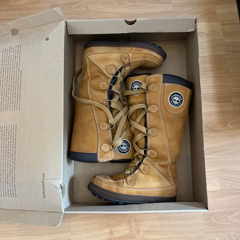 Timberland støvler i størrelse 38. Støvlene er laget i skinn med kraftig yttersåle i gummi. De har høyt skaft med snøring foran og fôr på innsiden for økt komfort og varme. Egnet som robuste fritidsstøvler til bruk i kjøligere vær og på variert underlag.