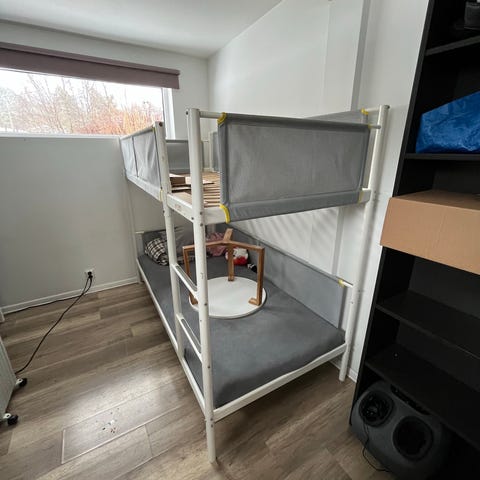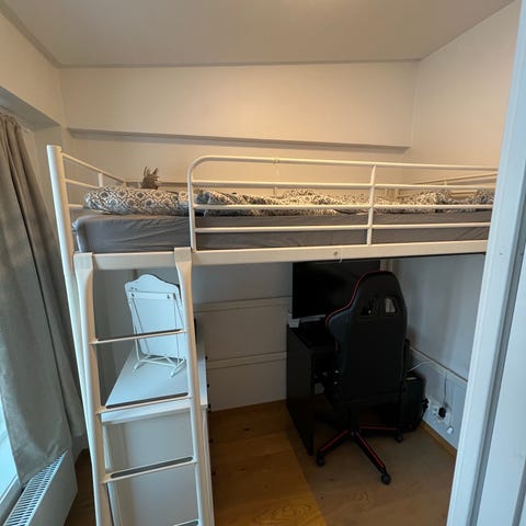 IKEA loftseng i hvit utførelse med grå sengehest. Sengen har stige i front og god plass under sengen til for eksempel skrivepult, oppbevaring eller sitteplass. Egnet til barnerom der man ønsker å utnytte gulvplassen under sengen.