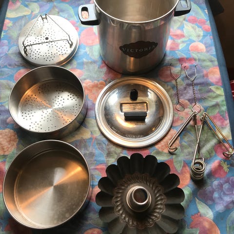 Gammelt kjøkkenutstyr - sil, brødform, vannkoker