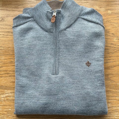 Morris genser med halv glidelås for herre i størrelse XL. Genseren har høy hals med kort glidelås i front og ribbestrikkede kanter nederst og på ermene. Fargen er beige/mellombrun, og den har Morris -logo på brystet. Passer til hverdagsbruk og kan kombineres med både bukse og jeans.