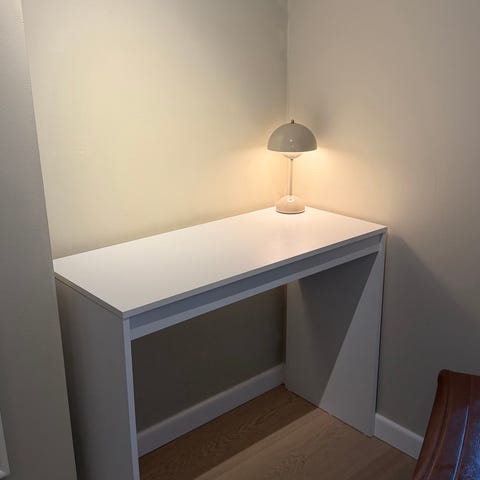 Pent brukt skrivebord med ekstra arbeidsflate til å trekke ut ved behov. Liten rift på bordflaten, ellers helt og pent.
