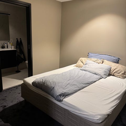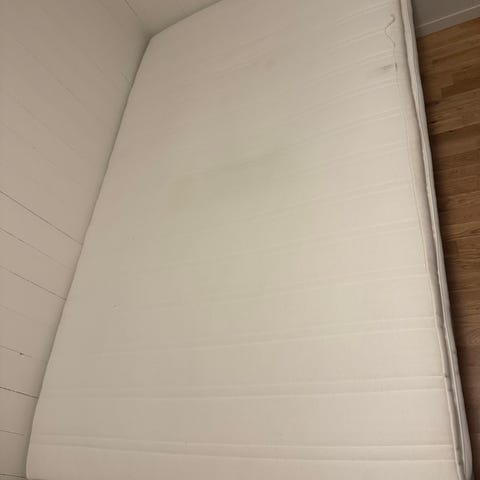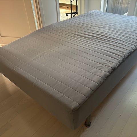 120x200x40 med overmadrass (3cm) selges pga opprydding. Har stått på gjesterom, lite brukt. Noen merker i madrassen som trolig kan vaskes av.