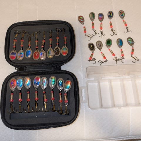 Blandet pakke med ulike fiskesluker og wobblere. Fikk alt i en adventskalender, Kinavarer
