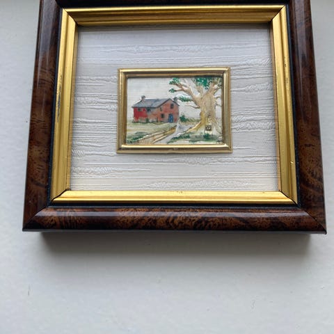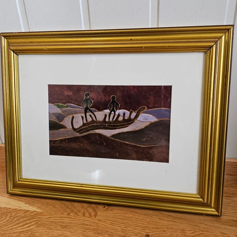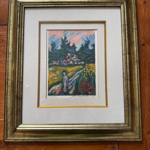 Innrammet bilde av ukjent kunstner med motiv av mennesker som går langs en vei i et landskap med trær og blå himmel. Bildet er montert med passepartout i en gullfarget ramme. Rektangulært format, egnet til oppheng på vegg i stue, gang eller andre oppholdsrom. Baksiden har opphengsfeste for enkel montering på vegg.