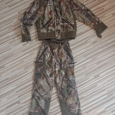 Jakken har oransje ytterstoff kombinert med skogskamuflasje, hel glidelås foran og flere lommer. Buksen har elastisk linning og kamuflasjemønster med forsterkede felt i ensfarget stoff.