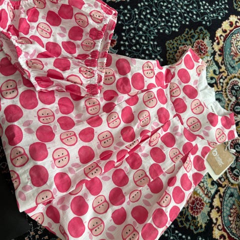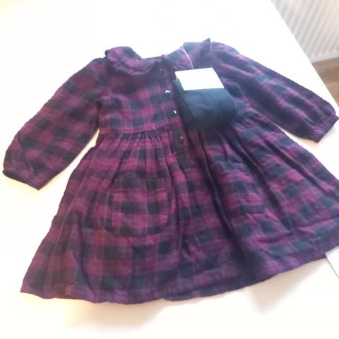 Kjole med underbukse/shorts. Det står at den er str 6-9 mnd (69-72 cm), men jeg vil si den tilsvarer ste. 68.