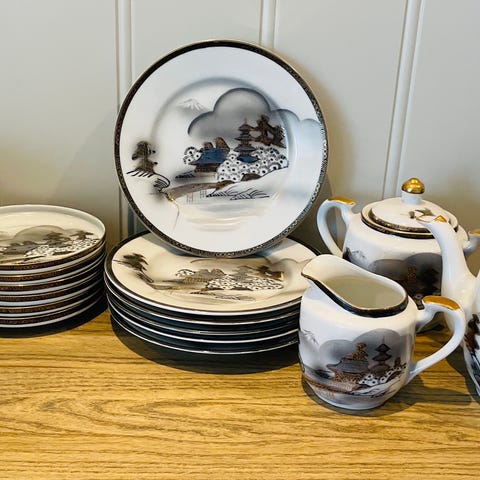 Serviset har vakker iriserende/perlemorfinish med klassiske romantiske motiver og gullstaffering. Et dekorativt og eksklusivt sett som egner seg både til bruk og som samlerobjekt.
