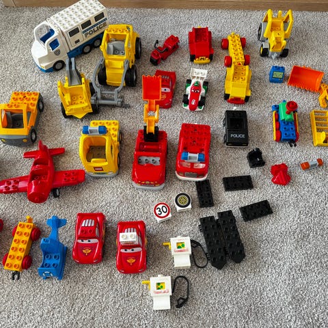 LEGO DUPLO klosser og kjøretøy, stort blandet sett. Inneholder diverse byggeklosser i flere farger, figurer og ulike kjøretøy som brannbil, helikopter, lastebil, racerbil, sementbil, søppelbil, hjullaster, tog og traktor. Settet inkluderer mange dyr, stor drage og diverse tilbehør, se bilder. Følger også med stort sett (60+ deler) med Toy2 track connectors for å bygge duplo og brio-tog sammen.