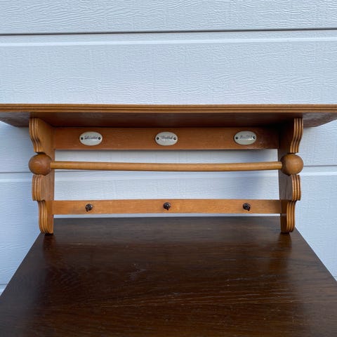 Hylla har naturlige bruksspor og mangler noen dreide kuler/detaljer (se bilder). Dette er kun kosmetisk og påvirker ikke stabilitet eller funksjon.