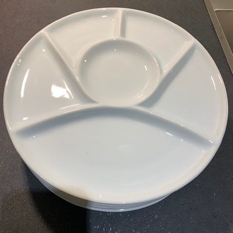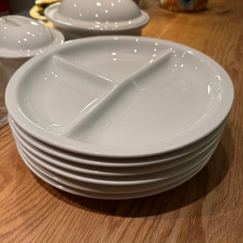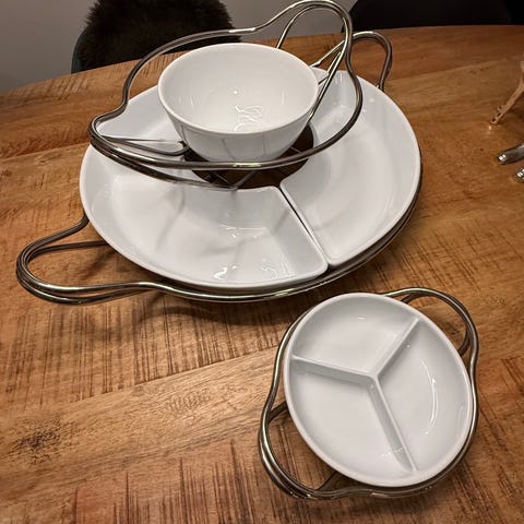 Selger originalt Sambonet serveringssett i hvitt porselen og rustfritt stål.